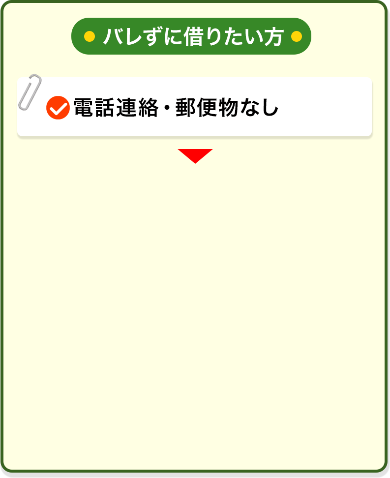 来店なし、電話なし、郵送物なしで申込が可能です。家族や会社の方にバレにくいのでこっそり借りたい方におすすめです。 -